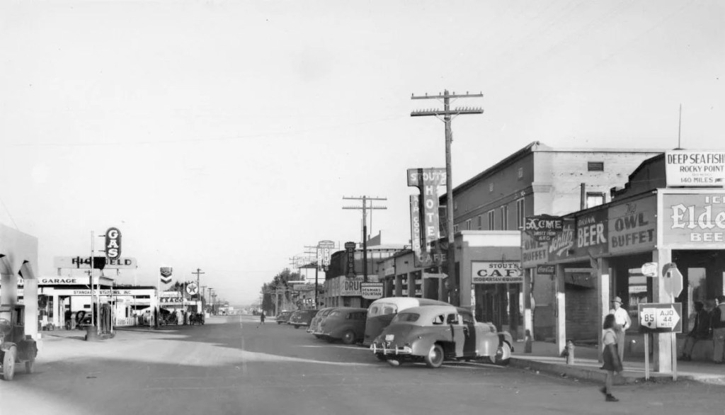 What is the norm for us today- automobile use as transportation, didn’t gain popularity in the states till the 1910s. By 1921, the newly built U.S. route 80 (now known as Old U.S. Route 80) was constructed, bringing a new set of needs for travelers and lodgers in Gila Bend. Commercial activity would respond to the shift and Pima Street would become the “new” main event.